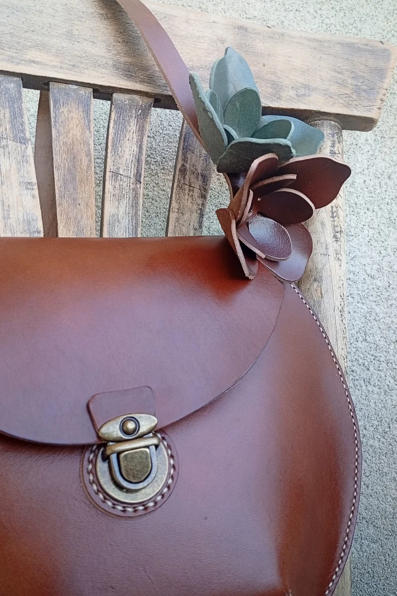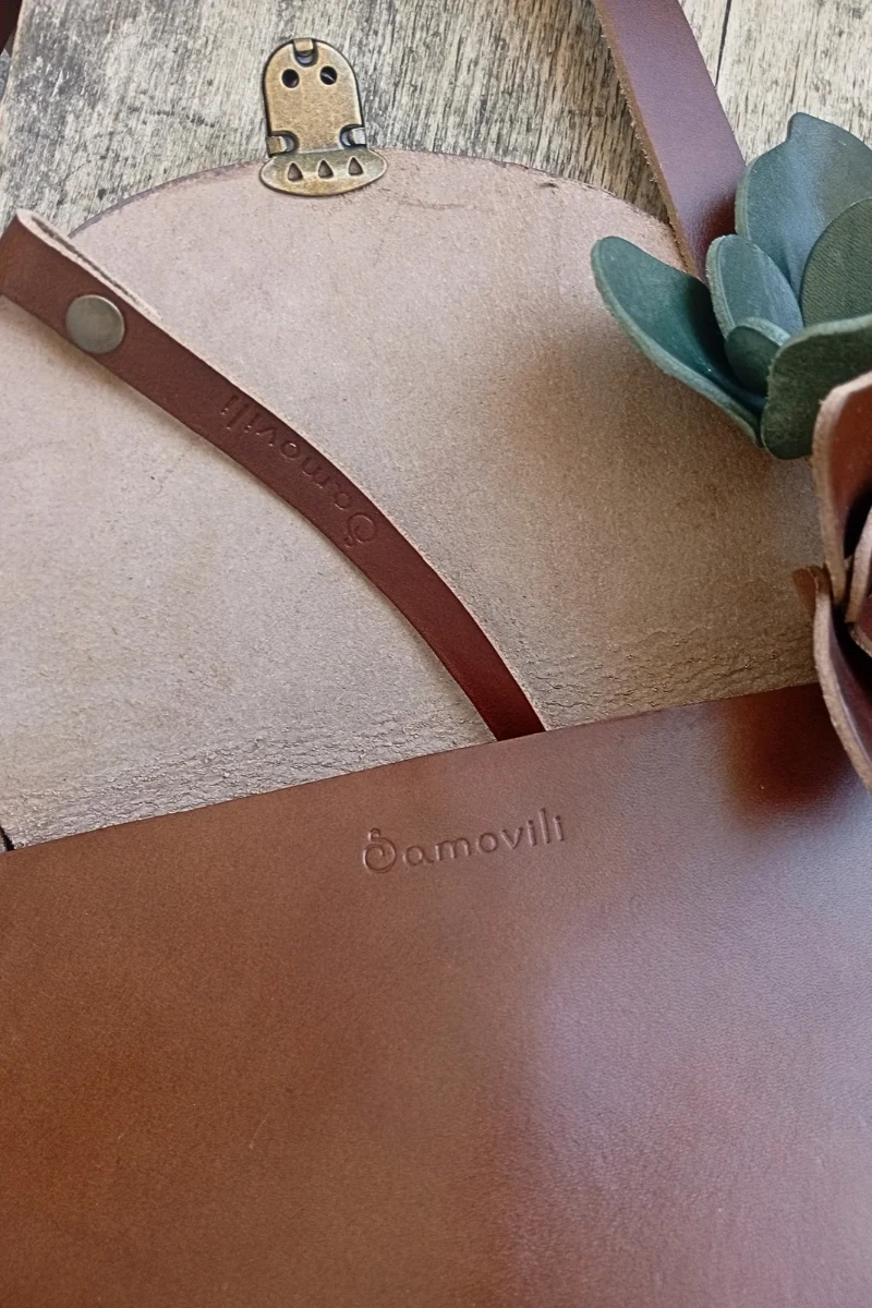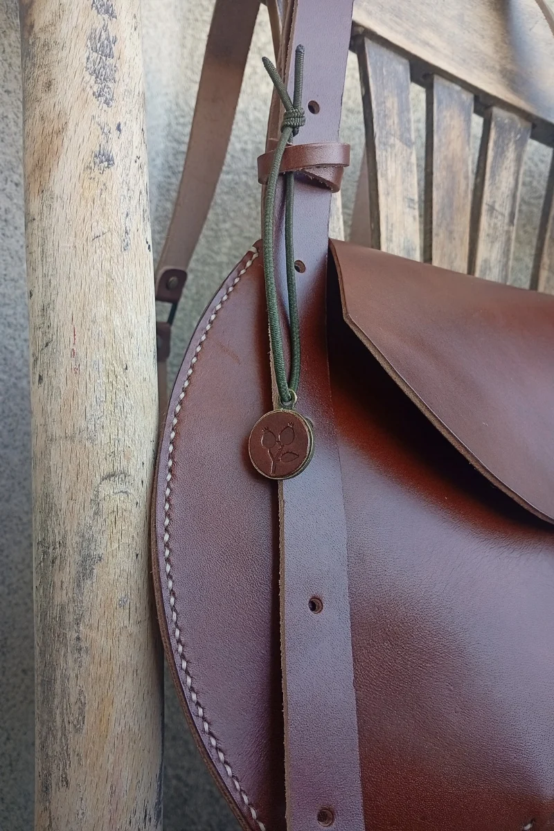 Материал: естествена телешка кожа (растително дъбен бланк с дебелина 2 мм); метал – месинг.